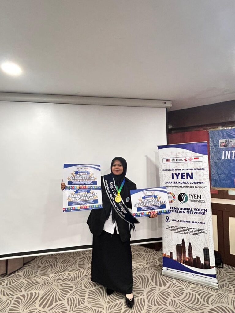 Sementara itu, mahasiswa kedua, Kamala Shintya, mencatatkan prestasi yang tidak kalah membanggakan. Kamala meraih Juara 1 Best Project Innovation, Juara 2 Best Presentation, serta dinobatkan sebagai The Most Favorite Delegate. Penghargaan ini diberikan berdasarkan penilaian juri dan partisipan, yang mencerminkan kualitas gagasan, kemampuan presentasi, serta kepribadian dan kepemimpinan Kamala selama kegiatan berlangsung.