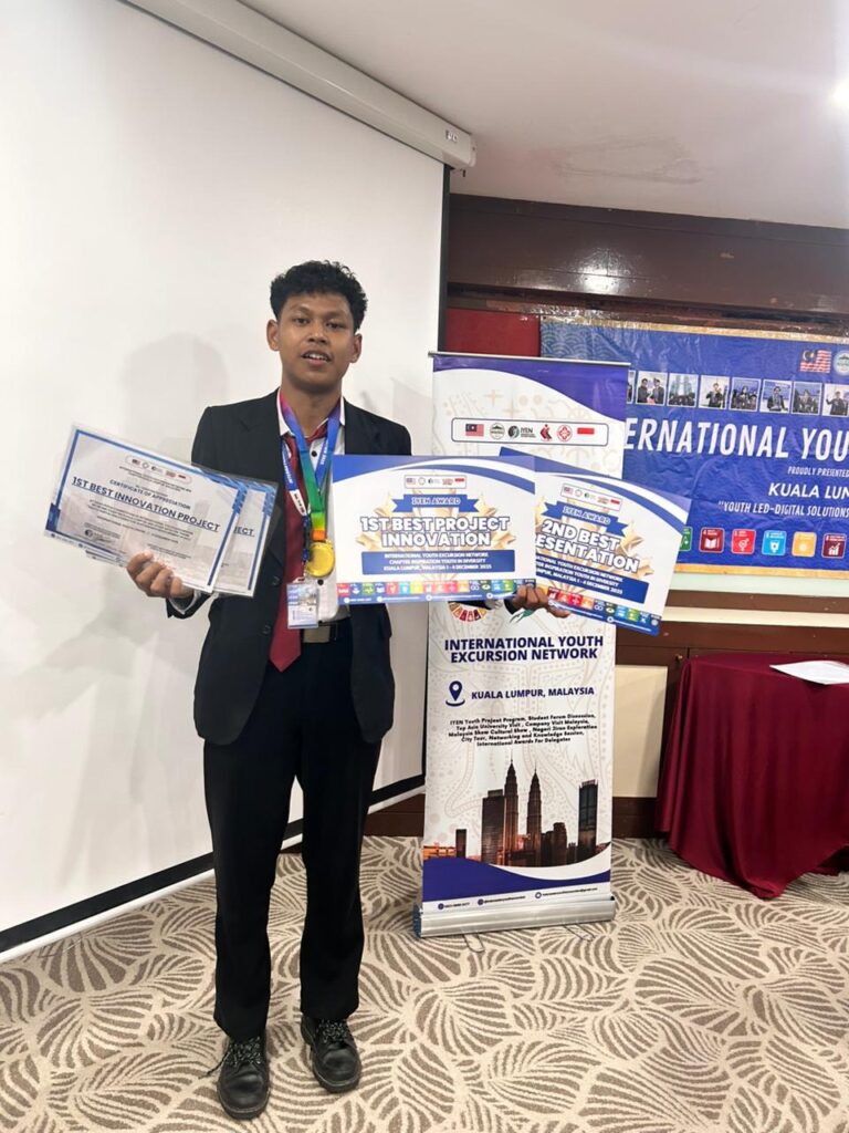 Mahasiswa pertama, Rahmanda Kahsfahri, berhasil meraih Juara 1 Best Project Innovation serta Juara 2 Best Presentation Putra. Prestasi ini menunjukkan kemampuan Rahmanda dalam merancang inovasi proyek yang kreatif sekaligus menyampaikannya secara komunikatif dan kompetitif di tingkat internasional.