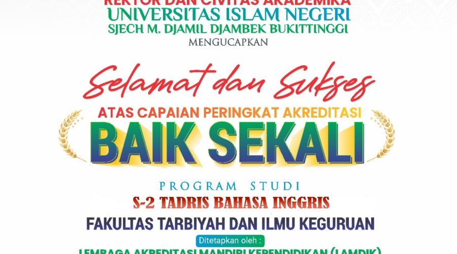 Selasa, 5 Maret 2024 Prodi S2 Tadris Bahasa Inggris Fakultas Tarbiyah dan Ilmu Keguruan UIN Sjech M Djamil Djambek Bukittinggi mendapat kabar bahagia sehubungan dengan telah keluarnya hasil akreditasi perdana prodi S2 TBI dari Lembaga Akreditasi Mandiri Kependidikan (LAMDIK). Akreditasi perdana prodi S2 TBI ini memperoleh peringkat Baik sekali dengan skor 335 yang berlaku dari 10 Oktober 2023- 10 Oktober 2028. Hal ini menjadi suatu hal yang membanggakan mengingat...Read More