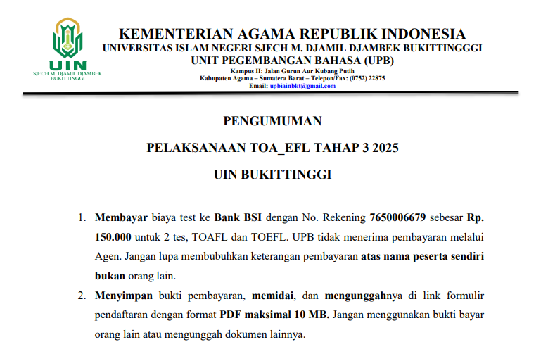 Diberitahukan kepada mahasiswa Fakultas Tarbiyah dan Ilmu Keguruan (FTIK) UIN Sjech M. Djamil Djambek Bukittinggi bahwa pendaftaran ujian TOAFL dan TOEFL tahap 3 tahun 2025 sudah dibuka. Info selengkapnya pada file di bawah ini. Terima kasih.Read More
