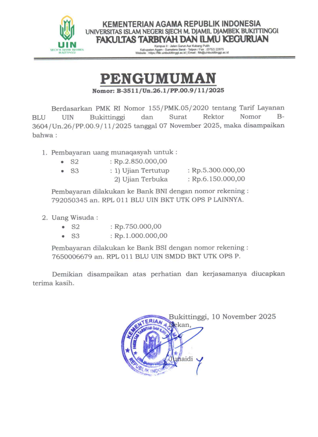 PENGUMUMAN PERPANJANGAN BEASISWA KIP KULIAН UIN SJECH M. DJAMIL DJAMBEK BUKITTINGGI JALUR SPAN-PTKIN, SPNA, SNBP, UM-PTKIN, SNBT, UM-MANDIRI TAHUN 2025 Diberitahukan kepada mahasiswa Fakultas Tarbiyah dan Ilmu Keguruan angkatan tahun 2025 bahwa penerimaan Beasiswa KIP Kuliah UIN Bukittinggi Tahun 2025 diperpanjang sampai dengan tanggal 14 September 2025. Pendaftaran dilakukan melalui akun e-Campus masing-masing...Read More