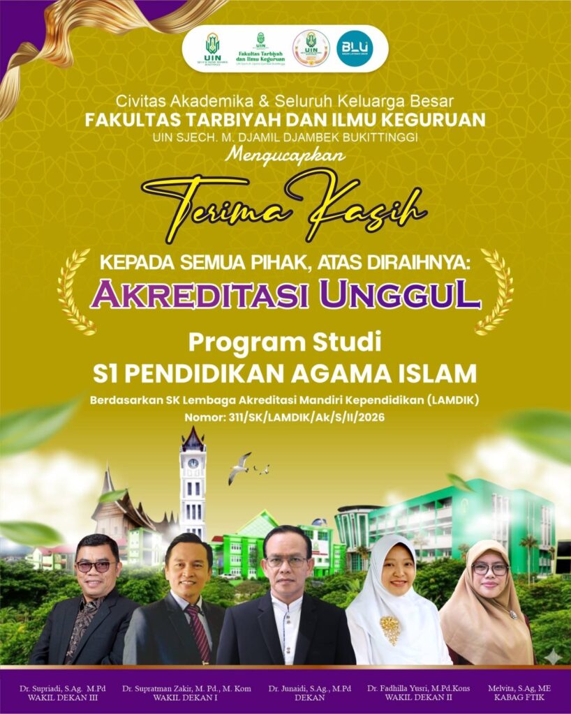 Bukittinggi (3/3); Program Studi (S1) Pendidikan Agama Islam Fakultas Tarbiyah dan Ilmu Keguruan Universitas Islam Negeri (UIN) Sjech M. Djamil Djambek Bukittinggi kembali meraih Akreditasi UNGGUL dari Lembaga Akreditasi Mandiri Kependidikan (LAMDIK). Khabar gembira yang patut disyukuri ini diperoleh setelah mendapatkan SK Akreditasi dari LAMDIK dengan Nomor : 311/SK/LAMDIK/Ak/S/II/2026.