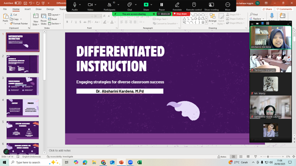 Dalam kesempatan tersebut, Dr. Absharini Kardena membawakan materi bertema “Differentiated Instruction for Diverse Learners”, yang menekankan pentingnya strategi pembelajaran yang mampu mengakomodasi keragaman gaya belajar siswa. Ia menyampaikan, “Kami ingin membekali para guru dengan strategi yang relevan untuk menghadapi berbagai kebutuhan siswa sehingga proses belajar dapat lebih optimal dan inklusif.”